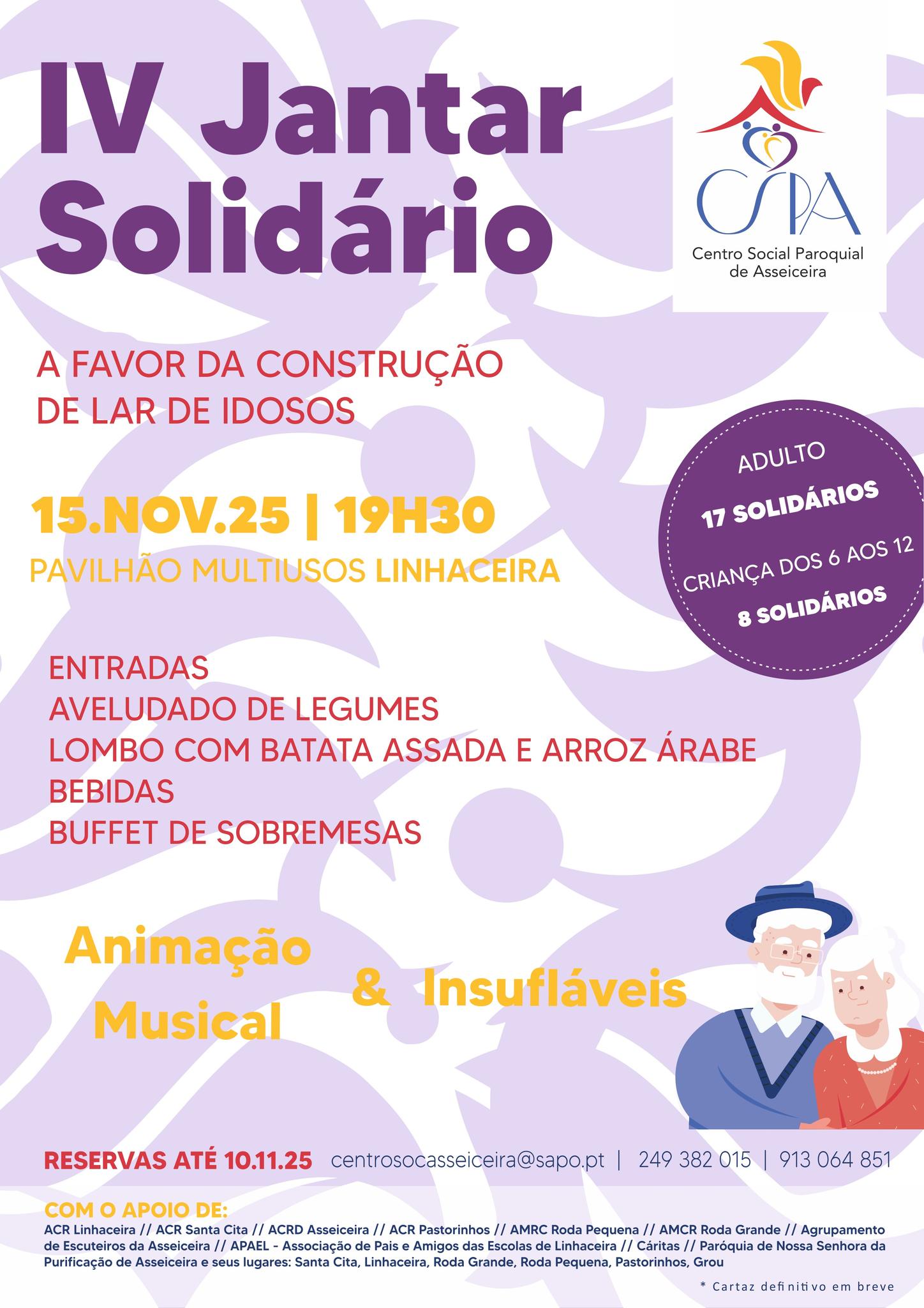 – 19h30 – IV Jantar Solidário, do Centro Social Paroquial de Asseiceira no Pavilhão Multiusos de Linhaceira. Org: Centro Social Paroquial de Asseiceira.
