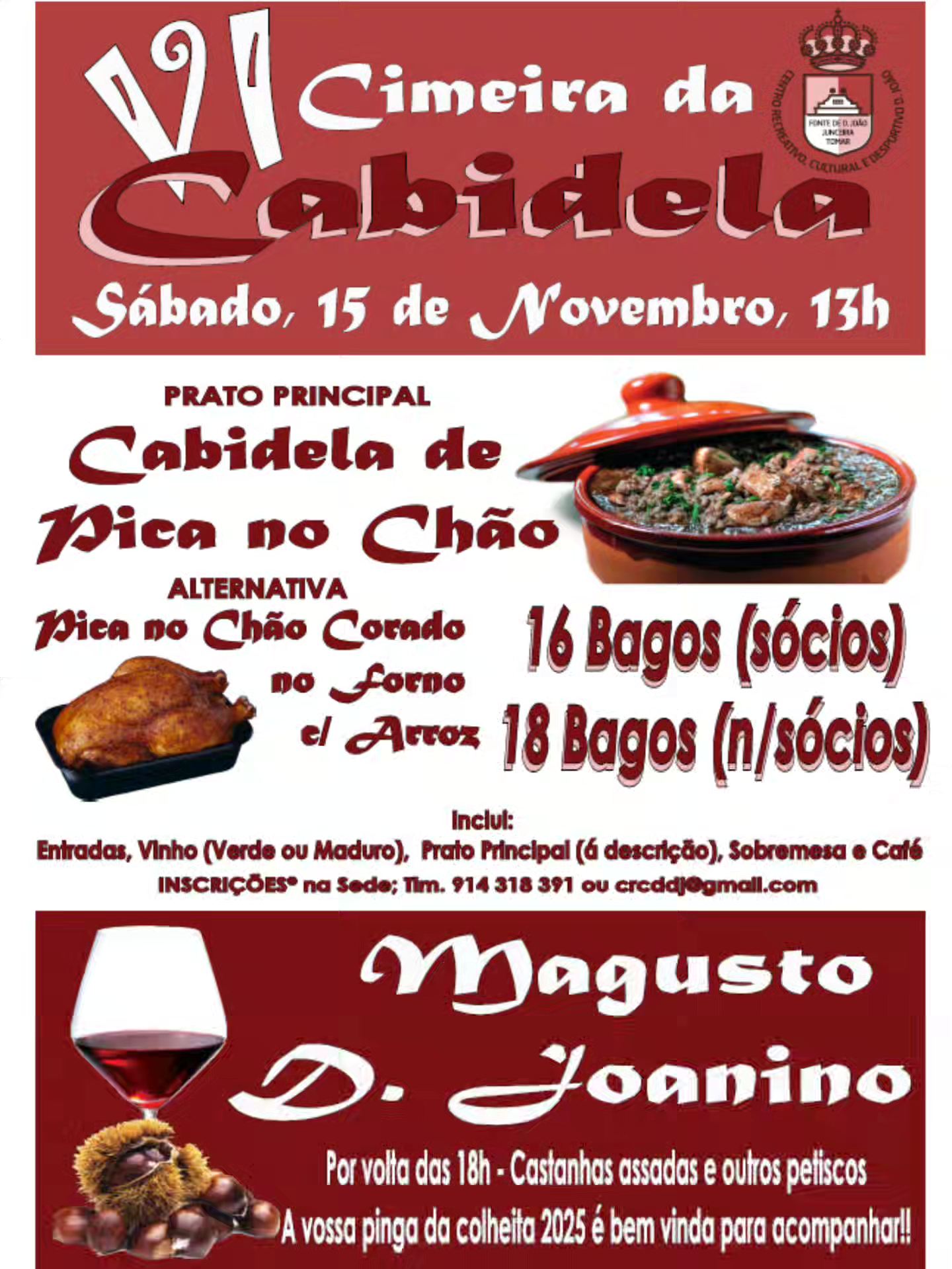 – 13h00 – Encontro gastronómico Cimeira da Cabidela na Fonte de D. João, freguesia da Junceira. Org. Centro Recreativo, Cultural e Desportivo D. João