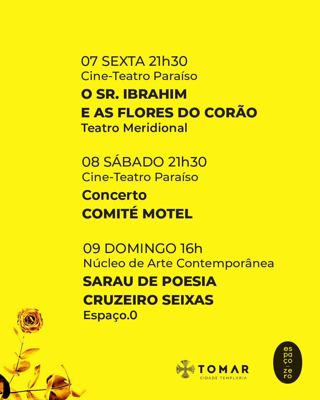 – 21h30 – Teatro “A Primeira Vez” da autoria de Tiago Coreia pela Companhia “A Turma”, integrado no Festival Zero no cineteatro de Tomar
