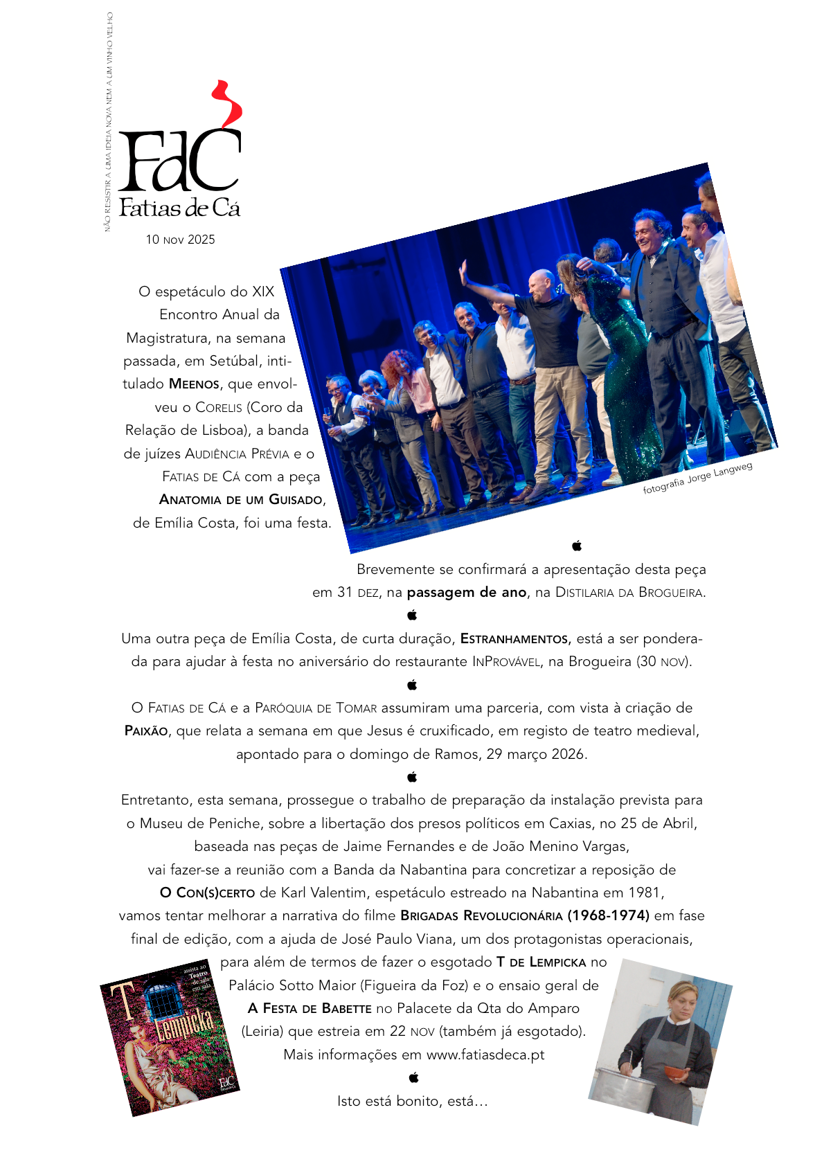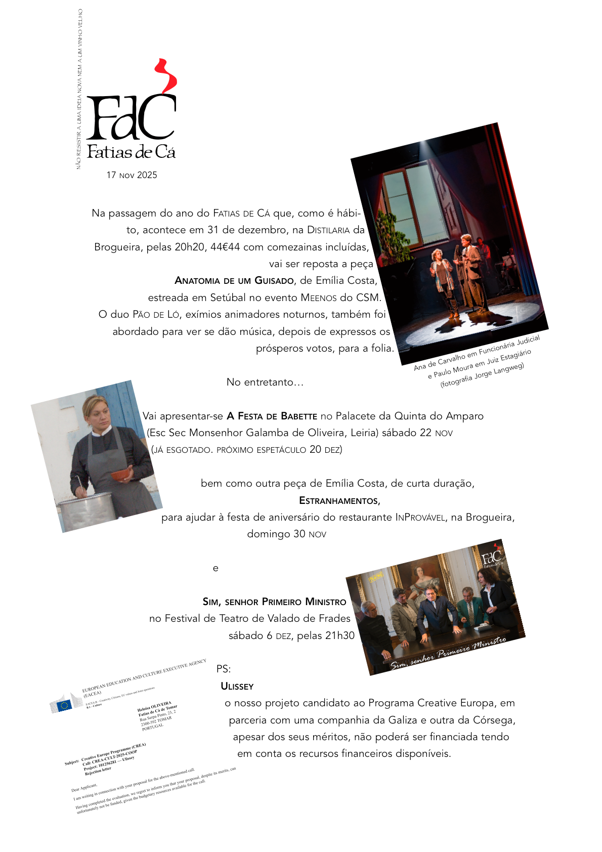Na passagem do ano do Fatias de cá que, como é hábito, acontece em 31 de dezembro, na DISTILARIA da Brogueira, pelas 20h20, 44€44 com comezainas incluídas, vai ser reposta a peça ANATOMIA DE UM GUISADO, de Emília Costa, estreada em Setúbal no evento Meenos do CSM.