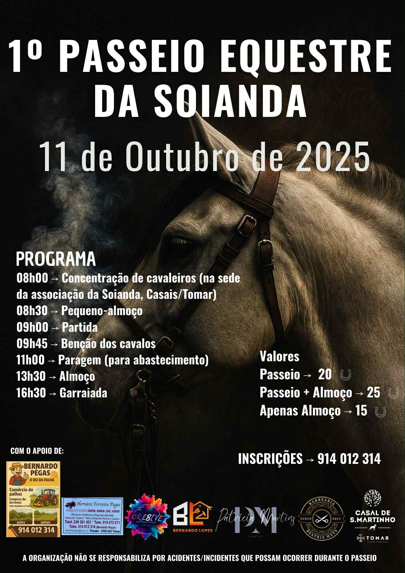 – 9h00 – 1º passeio equestre da Soianda, Casais, Tomar, com garraiada (16h30)