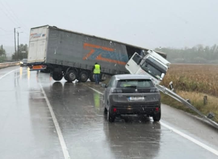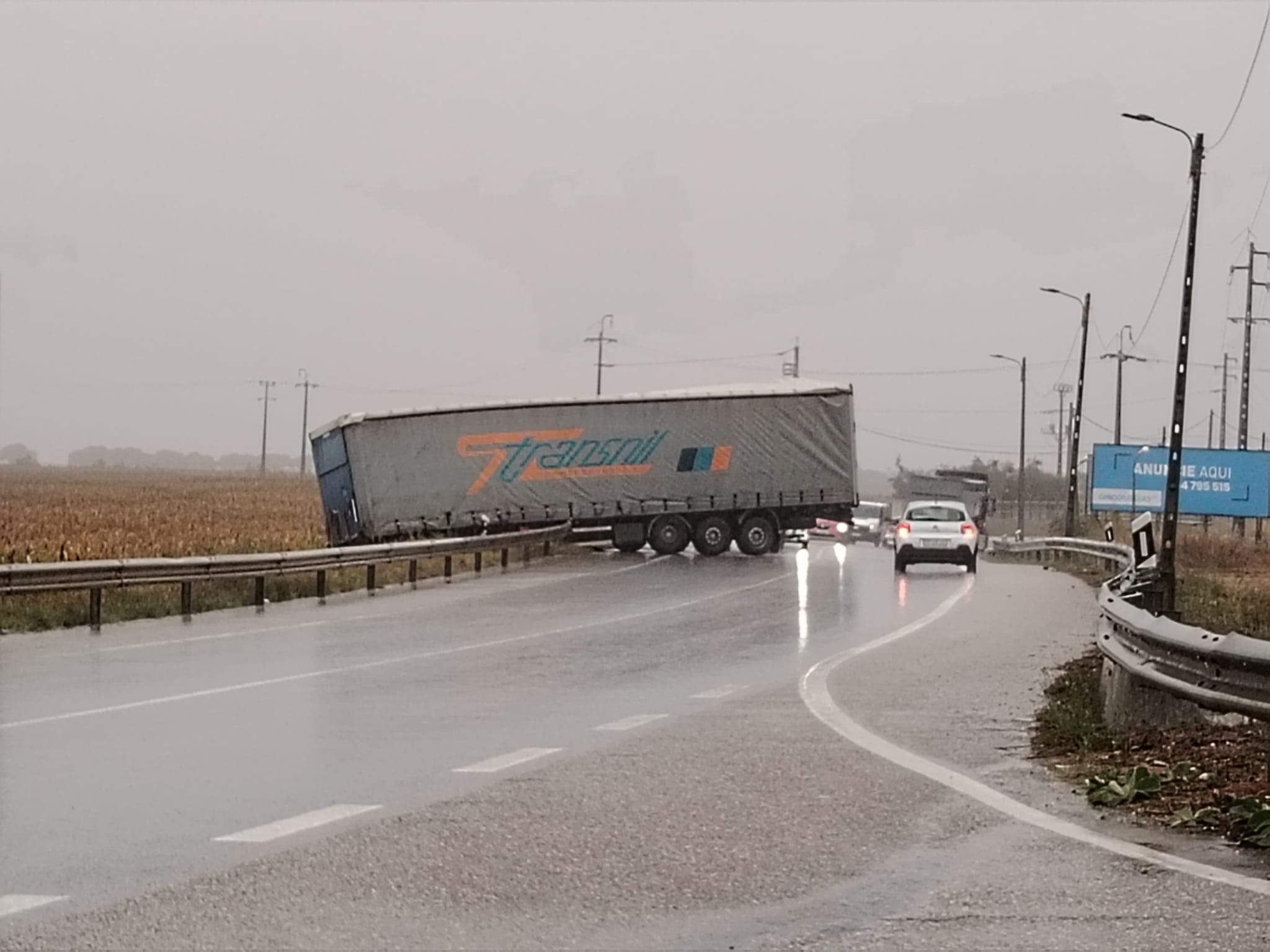 O camião seguia na direção Golegã- Entroncamento quando, pelo chamado efeito tesoura, saiu para fora da estrada.