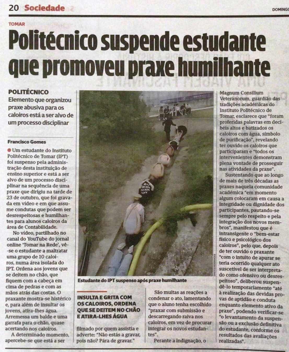 Depois de ser suspenso pelo Magnum Consillium Veteranorum, comissão que fiscaliza a prática das praxes no IPT, o aluno do Instituto Politécnico de Tomar que surge num vídeo a humilhar e a maltratar caloiros, foi também suspenso pela presidência do IPT.