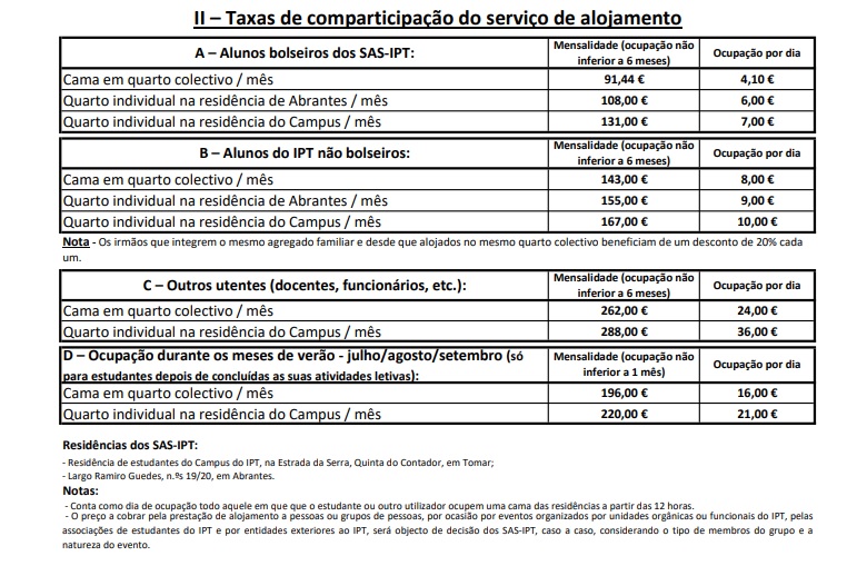 Os utilizadores das residências pagam uma mensalidade fixada anualmente pelos SAS-IPT, atualmente no valor de 89,12 € para os alunos bolseiros e de 140€ para os alunos não bolseiros, passando a 91,44 € para bolseiros e 143 € para não bolseiros a partir de 1 de outubro.