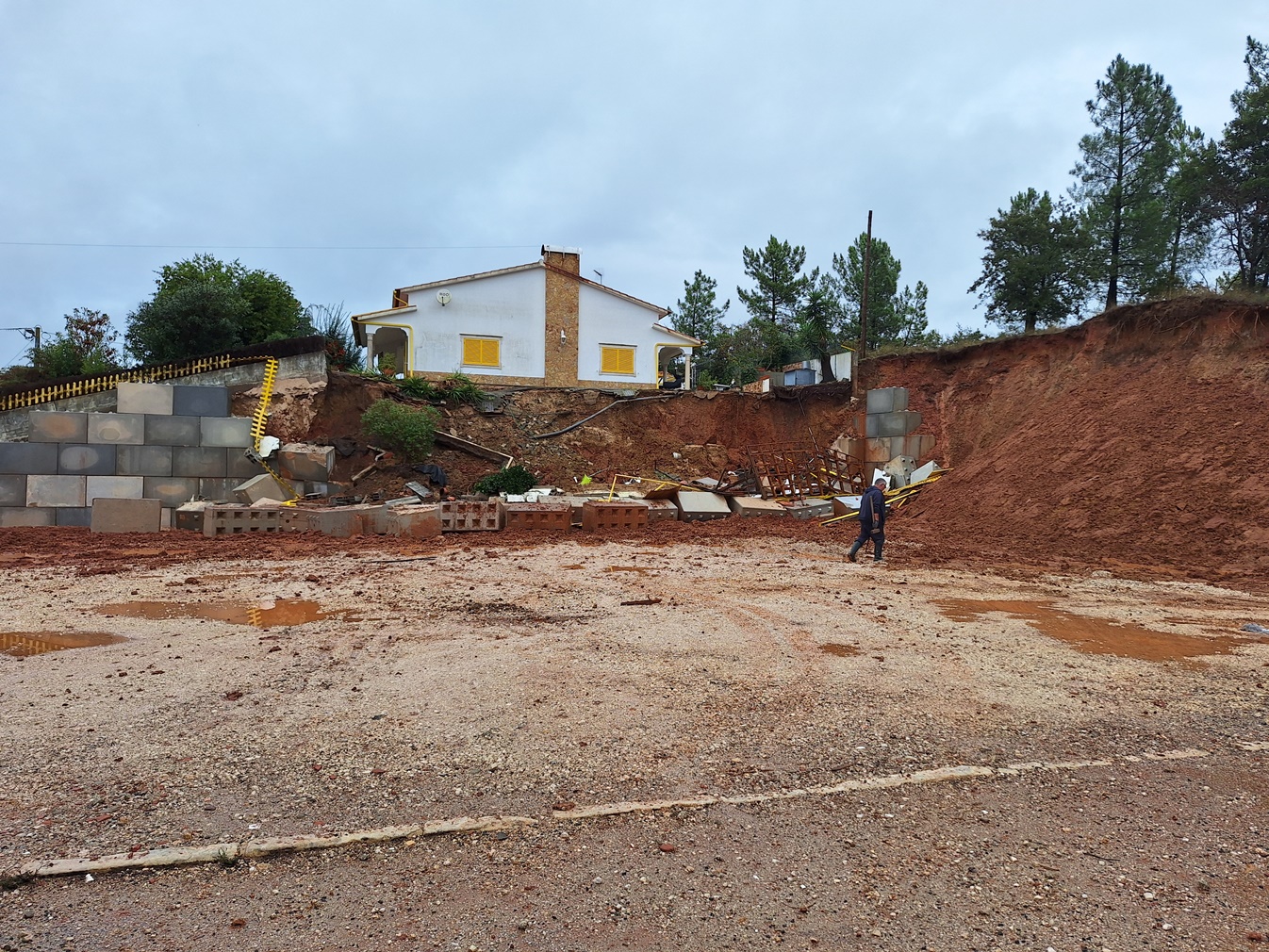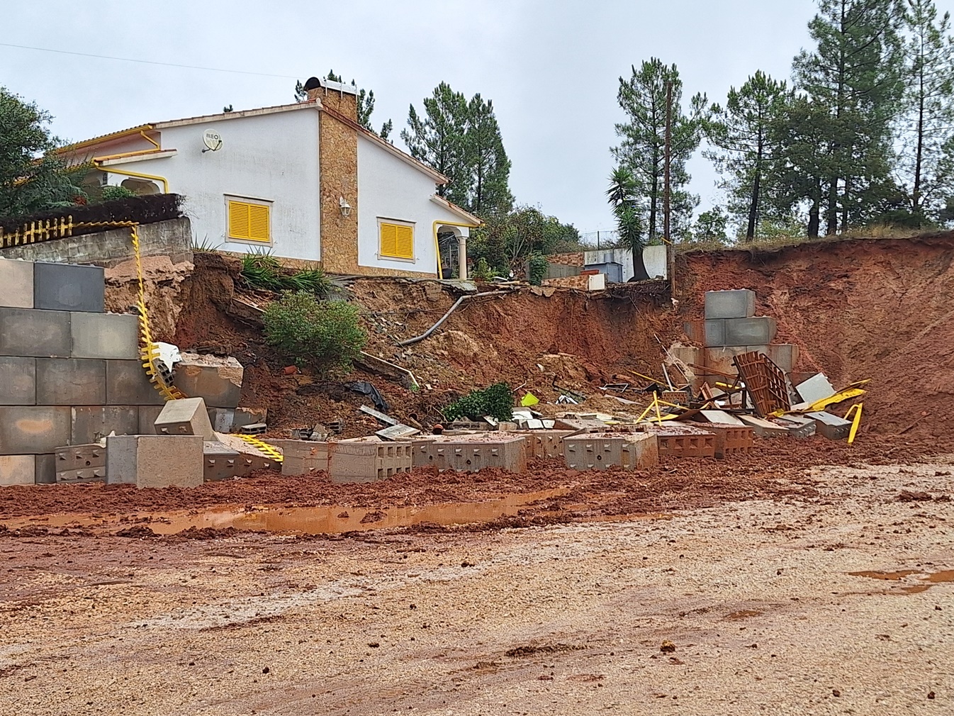Talvez devido às fortes chuvadas, o terreno cedeu e o muro ruiu trazendo consigo uma churrasqueira e parte do quintal da casa.