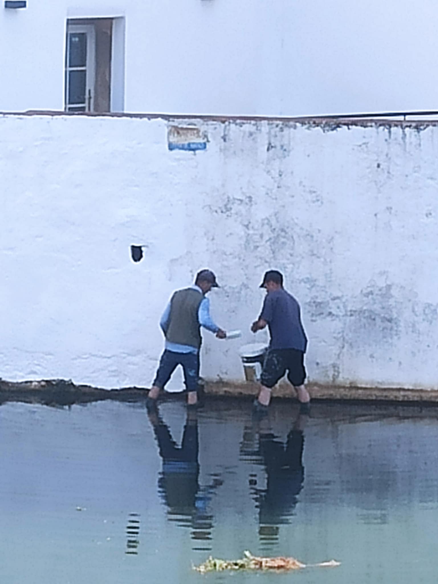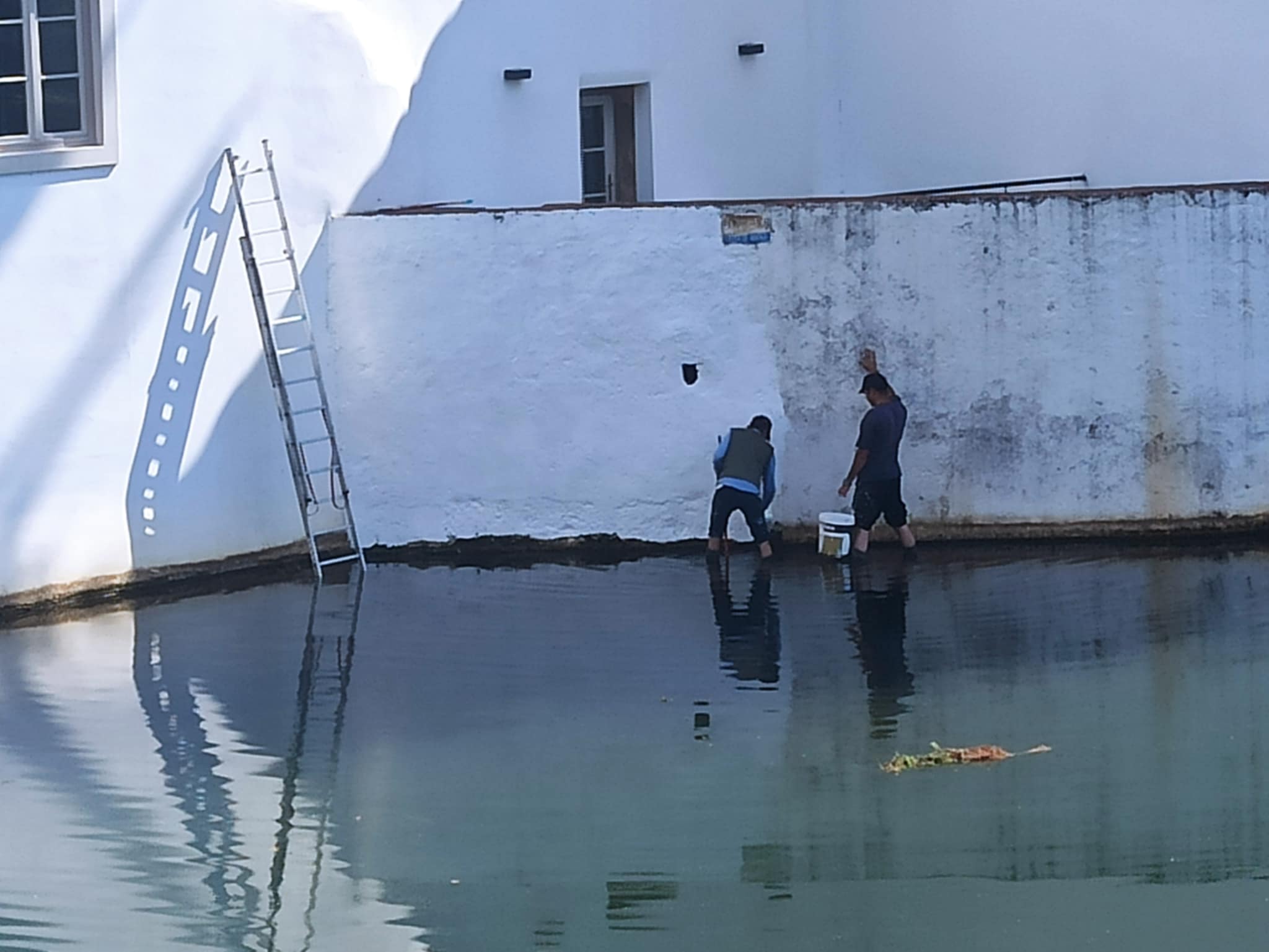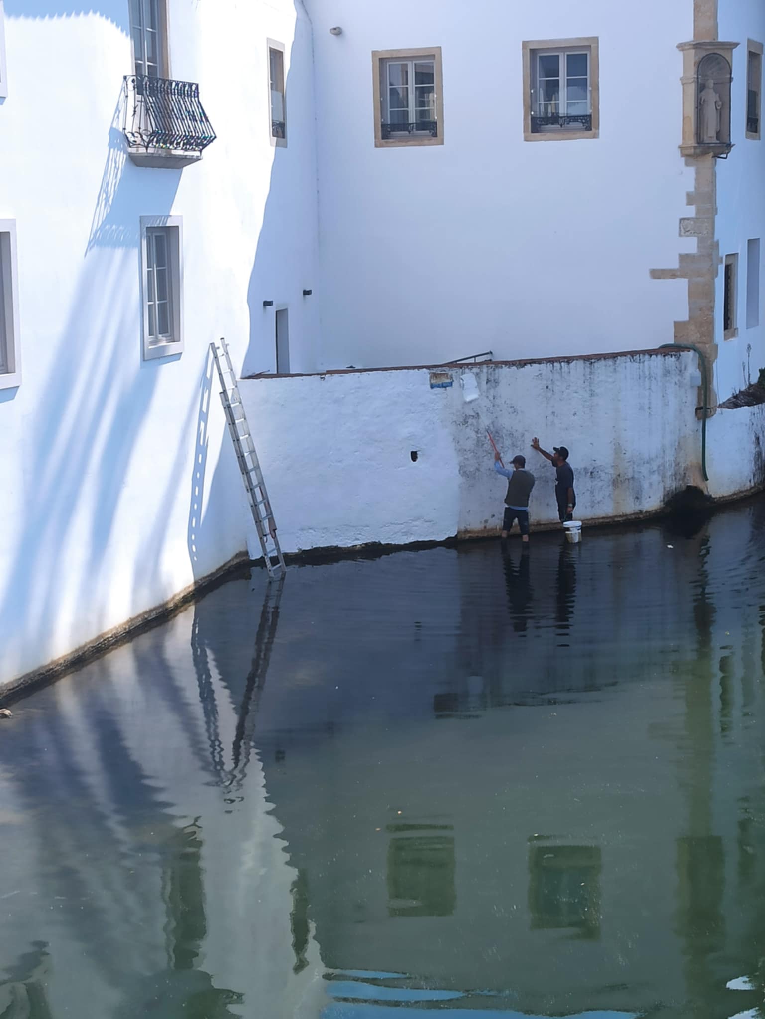 Dois homens estavam a pintar o muro do hotel Vila Galé com as calças arregaçadas e os pés nas águas do rio Nabão. Ao lado, um escadote.